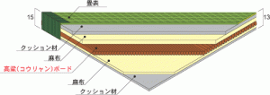 ワラの代わりにインシュレーションボードとフォームを組み合わせて作ることにより防虫効果・断熱効果を高めた畳です。フォームを畳底面に使用し隙間風による冷えを防止します。断熱・防虫効果あります。建材ⅠⅠⅠ型床(対応厚さ・・・45mm~60mm)