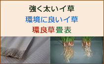 福岡県奨励品種「筑後みどり」というイ草です。イ草生産農家が手間をかけ、化学肥料を減らし10年以上低農薬有機肥料により改良された土壌で栽培しました。根が太く地中深くまで成長し、栄養分を効率よく吸収し、丈夫なイ草になりました。